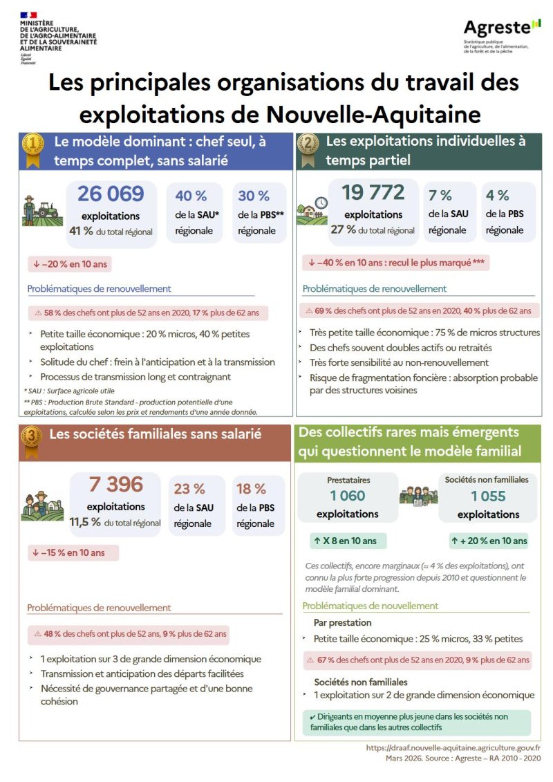 En recul au cours des 10 dernières années, l’exploitation agricole avec à sa tête un chef seul, à temps complet et sans salarié, reste la première forme d’organisation du travail en Nouvelle- Aquitaine. Souvent de petite taille, ces structures parfois vulnérables ont un risque accru de non renouvellement. Les exploitations familiales à plusieurs associés, ou un chef seul avec des salariés, sont toujours bien représentées mais leur nombre a également diminué au cours de la dernière décennie. Enfin, de nouveaux collectifs de travail, encore rares, ont émergé. Ce sont ceux qui ont le plus progressé depuis 2010 et questionnent le modèle courant de l’exploitation familiale. Ces collectifs, moins sensibles au non renouvellement, nécessitent toutefois l’acquisition de compétences spécifiques, notamment en gestion de ressources humaines.