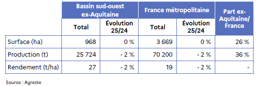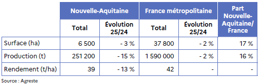 Au niveau national, la région Nouvelle- Aquitaine occupe le troisième rang avec 26 % de la surface et 16 % de la production, derrière Occitanie et Provence-Alpes-Côte-d’Azur.