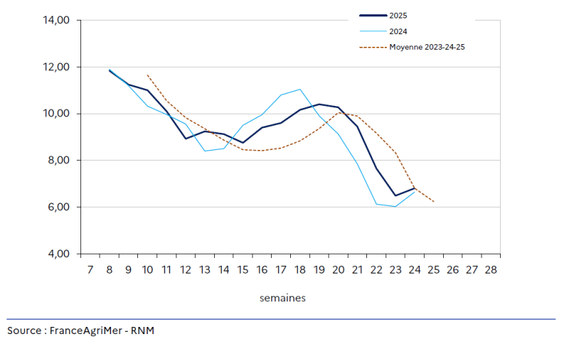 En juin, la chaleur affecte les variétés longues remontantes, mais les rondes conservent un certain dynamisme malgré la concurrence accrue des autres fruits.