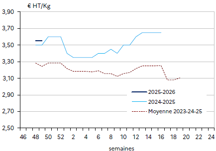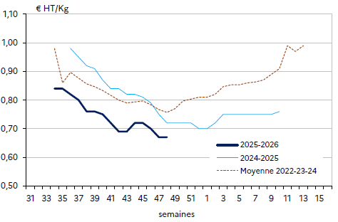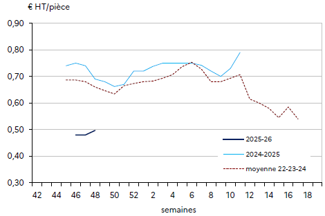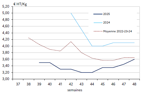En comparaison à l’année précédente, les cours en vrac 12 kg sont inférieurs, et les volumes commercialisés moindres.