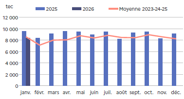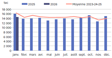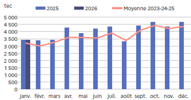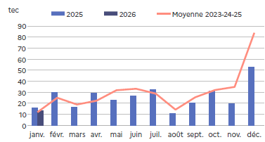 | janvier 2025 | Volume (en tonnes) | Nombre (en têtes) | Poids moyen (kg/tête) |