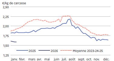 En ce début d’année 2026, les abattages régionaux de porcs charcutiers reculent de 8,5 % en poids par rapport à janvier 2025, affichant également un retrait de plus de 11 % à la moyenne triennale 2023-24-25. Dans le même temps, la cotation du porc charcutier poursuit sa baisse amorcée en 2025, et affiche en janvier une valeur inférieure de 14 % à celle janvier 2025. En janvier 2026, les abattages de volailles sont en baisse générale. Les abattages de poulets sont nettement inférieurs à janvier 2025 (−12,5 % en poids et −16,6 % en nombre). Mais ils restent néanmoins assez proches de la valeur triennale 2023-24-25, avec un retrait plus faible de 2,9 %. Les abattages de canards sont stables sur un an. Tandis que les abattages d’oies affichent une forte baisse de 18,3 % par rapport à janvier 2025. Le prix du foie gras reste stable à hauteur de 36 € HT/kg.