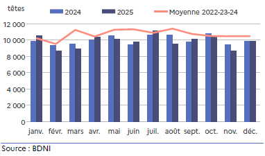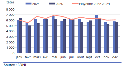 Les sorties pour abattage des génisses de race viande sont en retrait de 3,7 % sur l’année, avec un écart inférieur de 6,8 % à la moyenne triennale 2022-23-24.