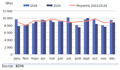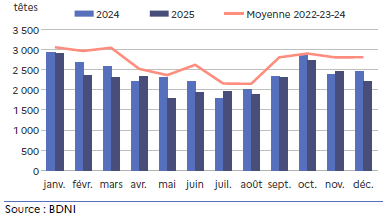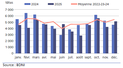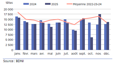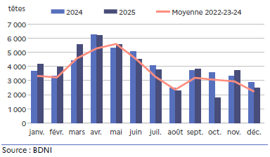 Les exports de broutards lourds sont stables alors que ceux des broutards légers diminuent de 4,3 %. Le contexte sanitaire lié à la MHE a entraîné une baisse des vêlages en 2024 avec une réduction de l’arrivée des broutards sur le marché. Au mois de décembre 2025, les 6 082 têtes exportées sont en hausse de près de 4,5 % par rapport à décembre 2024.