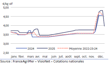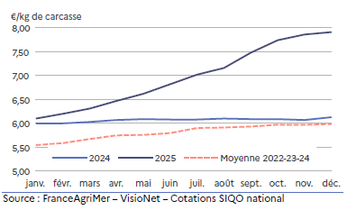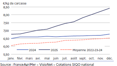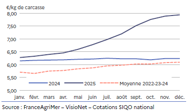 Début septembre, elle est à son niveau le plus bas, affichant un creux bien marqué de 8,91 €/kg de carcasse, soit 8,1 % de moins qu’en septembre 2024. Ensuite elle se stabilise. Soutenue par une offre automnale faible, elle amorce en novembre sa hausse saisonnière.