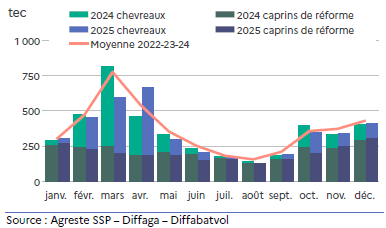 Le poids total des chevreaux abattus sur l’année est en très légère baisse (– 0,7 %) par rapport à 2024, alors que le nombre diminue plus fortement (−2,6 %), indiquant une tendance à l’engraissement comme pour les ovins.