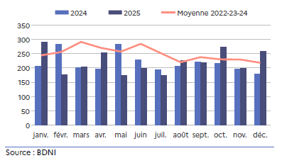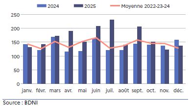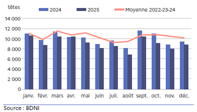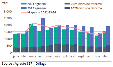 La production en 2025 n’a pas semblé entamer de baisse saisonnière aussi marquée que les années précédentes. Ainsi, les abattages de l’année 2025 sont supérieurs de près de 20 % à ceux de 2024, et de 10 % à ceux de la moyenne triennale 2022-23-24. Cette hausse régionale de la production est notamment liée au rachat en juin 2024 du 1er abattoir d’agneaux de France Sodem par le groupe Bigard au Vigeant (86).