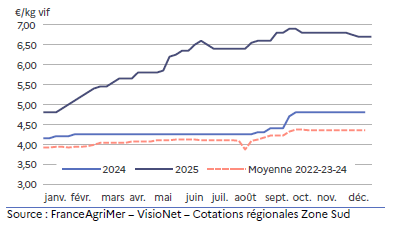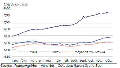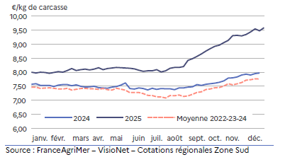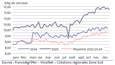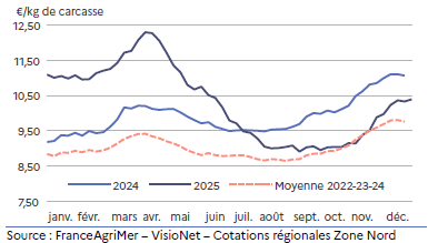 La cotation régionale atteint 10,33 €/kg de carcasse soit 6 % au-dessus de la moyenne triennale 2022-23-24 mais près de 7 % de moins qu’en décembre 2024.