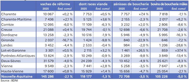 La production cumulée des génisses de boucherie en Nouvelle-Aquitaine diminue de 3,5 % en 2025 par rapport à la même période en 2024.