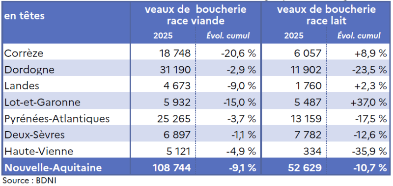 En 2025, 161 373 veaux de boucherie toutes races ont été abattus en Nouvelle-Aquitaine avec une baisse de plus de 9,6 % comparé à 2024.