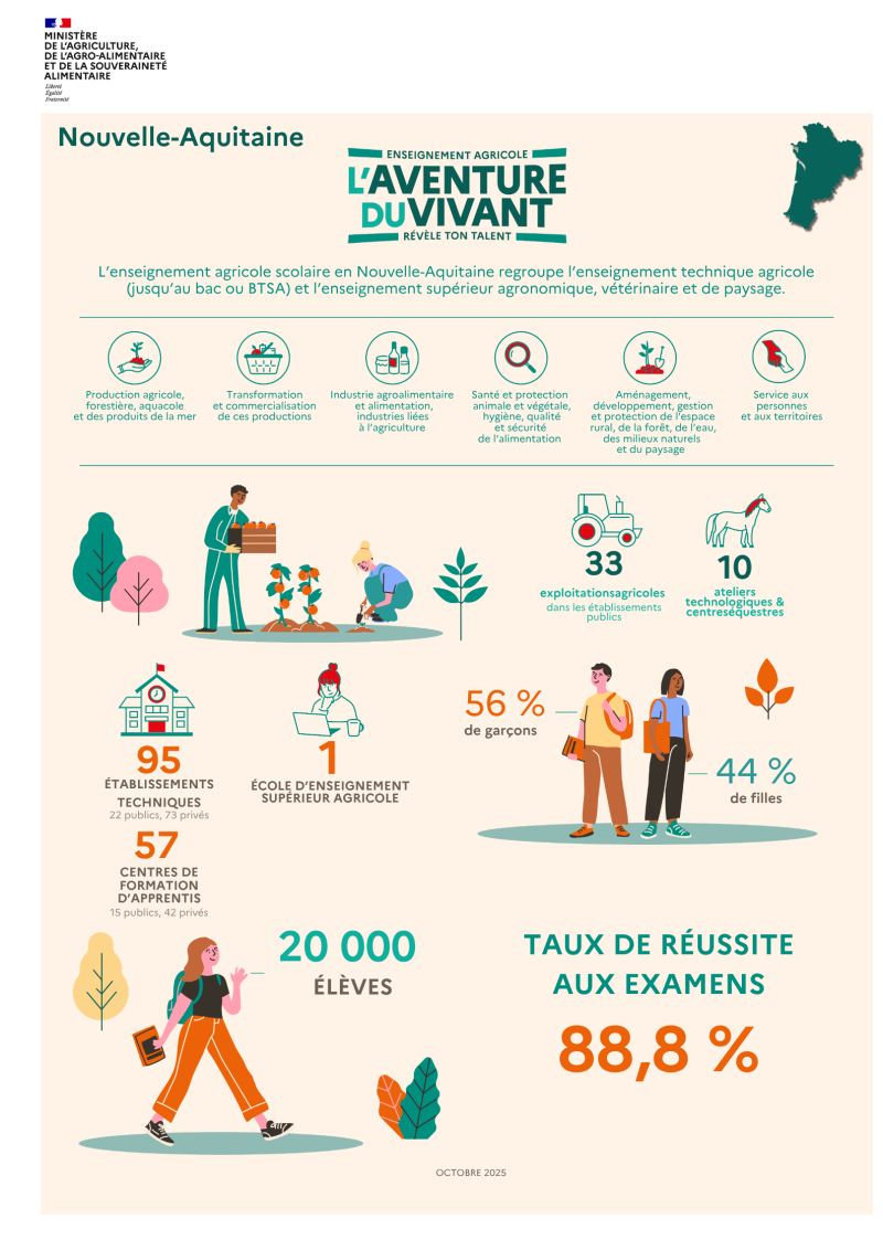 Première région française pour l’enseignement agricole, la Nouvelle-Aquitaine se distingue par la diversité de son offre de formation, couvrant l’ensemble des métiers de la production, de la transformation et de l’aménagement des territoires ruraux.