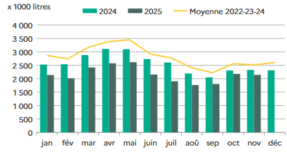 Note de lecture : En novembre 2025, 13 521 milliers de litres de lait ont été conditionnés en Nouvelle-Aquitaine pour un cumul de 173 082 milliers de litres depuis janvier. La production mensuelle est en baisse de 10,5 % par rapport au même mois de l’année précédente, et de 1,6 % en cumul depuis janvier.