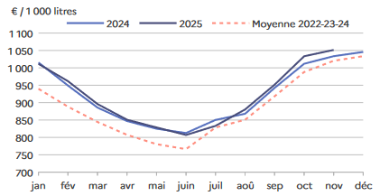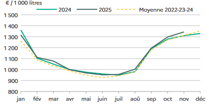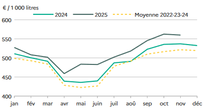 Graphique 2 : Prix mensuel du lait de vache en Nouvelle-Aquitaine
