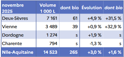 Note de lecture : En novembre 2025, 5 842 milliers de litres de lait ont été récoltés en Charente, dont 164 en agriculture biologique. Ces nombres sont en hausse de 2,2 % au total, et en baisse de 26,7 % pour le bio par rapport au même mois l’année précédente.