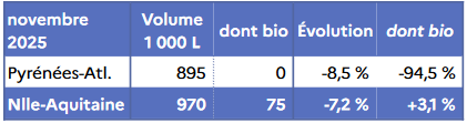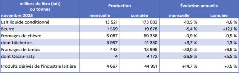 Note de lecture : En novembre 2025, 895 milliers de litres de lait ont été récoltés en Pyrénées-Atlantiques, dont 0 en agriculture biologique. Ces nombres sont en baisse de 8,5 % au total et de 94,5 % pour le bio par rapport au même mois l’année précédente