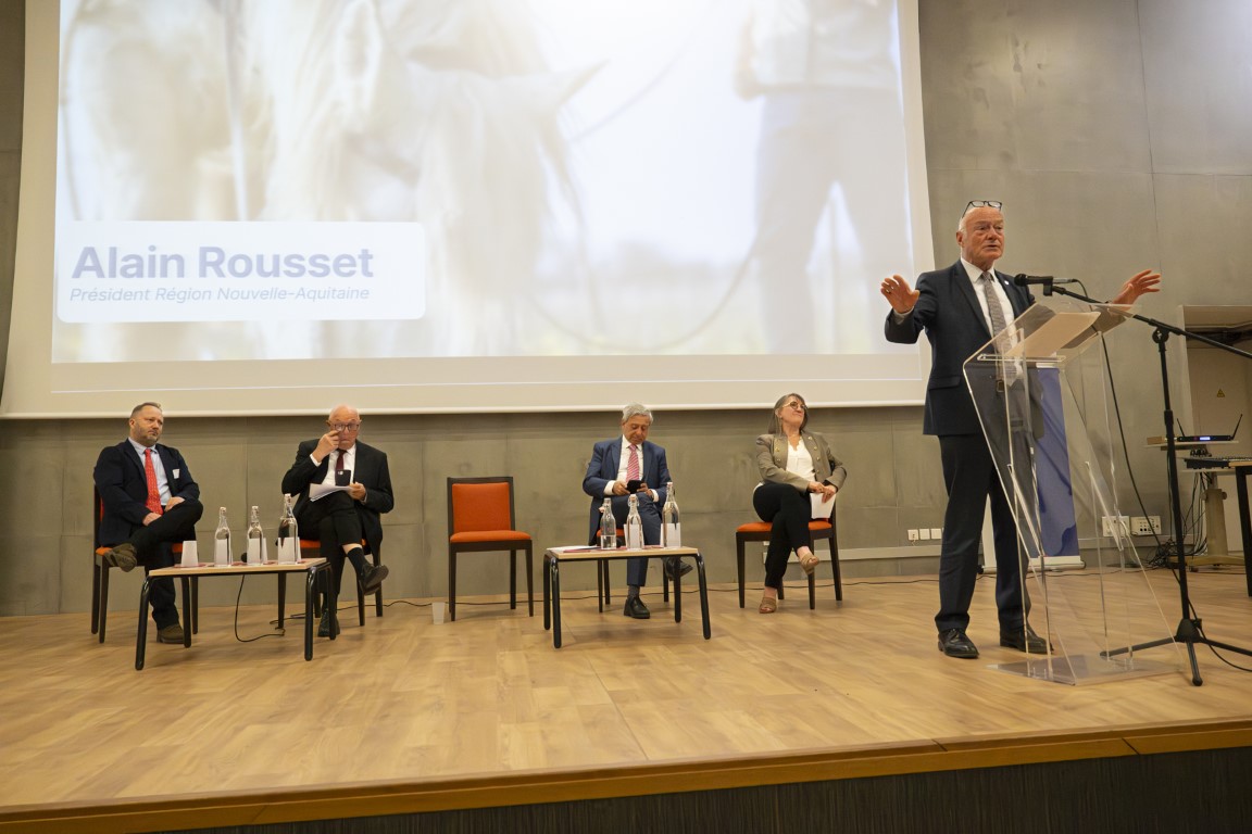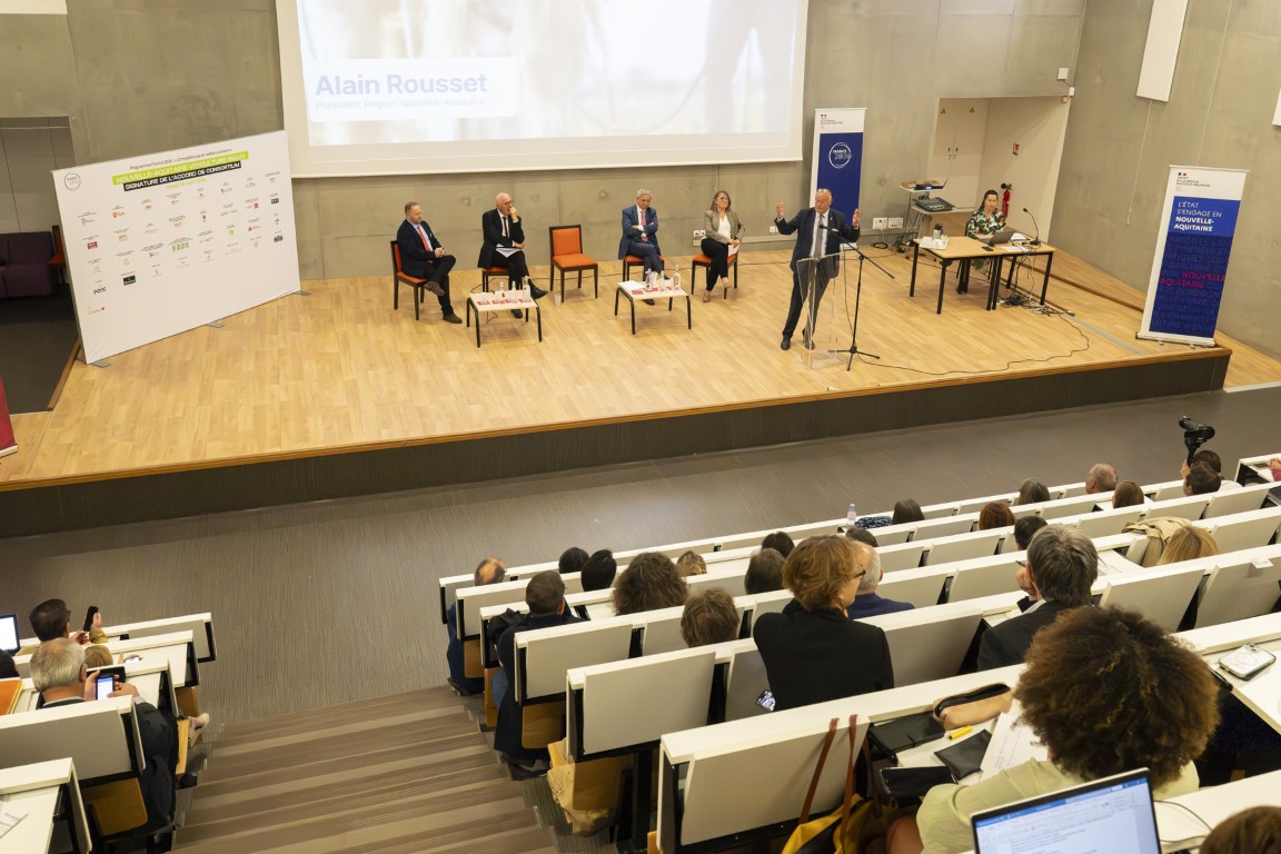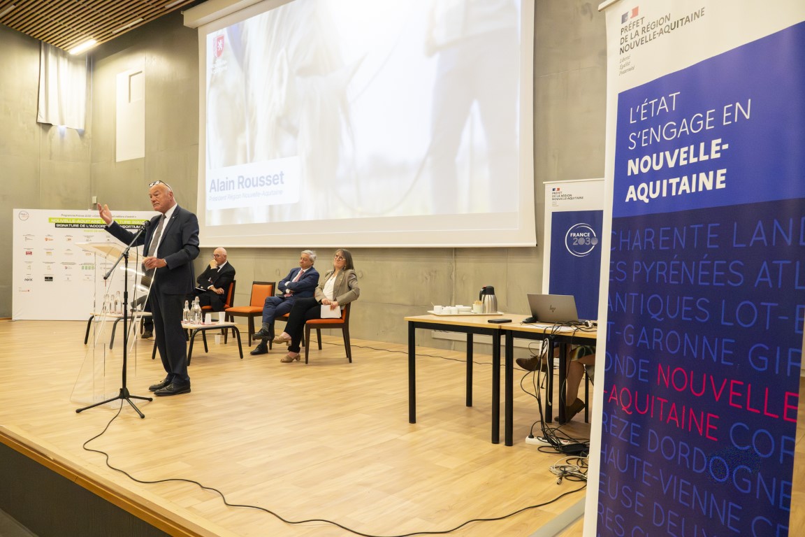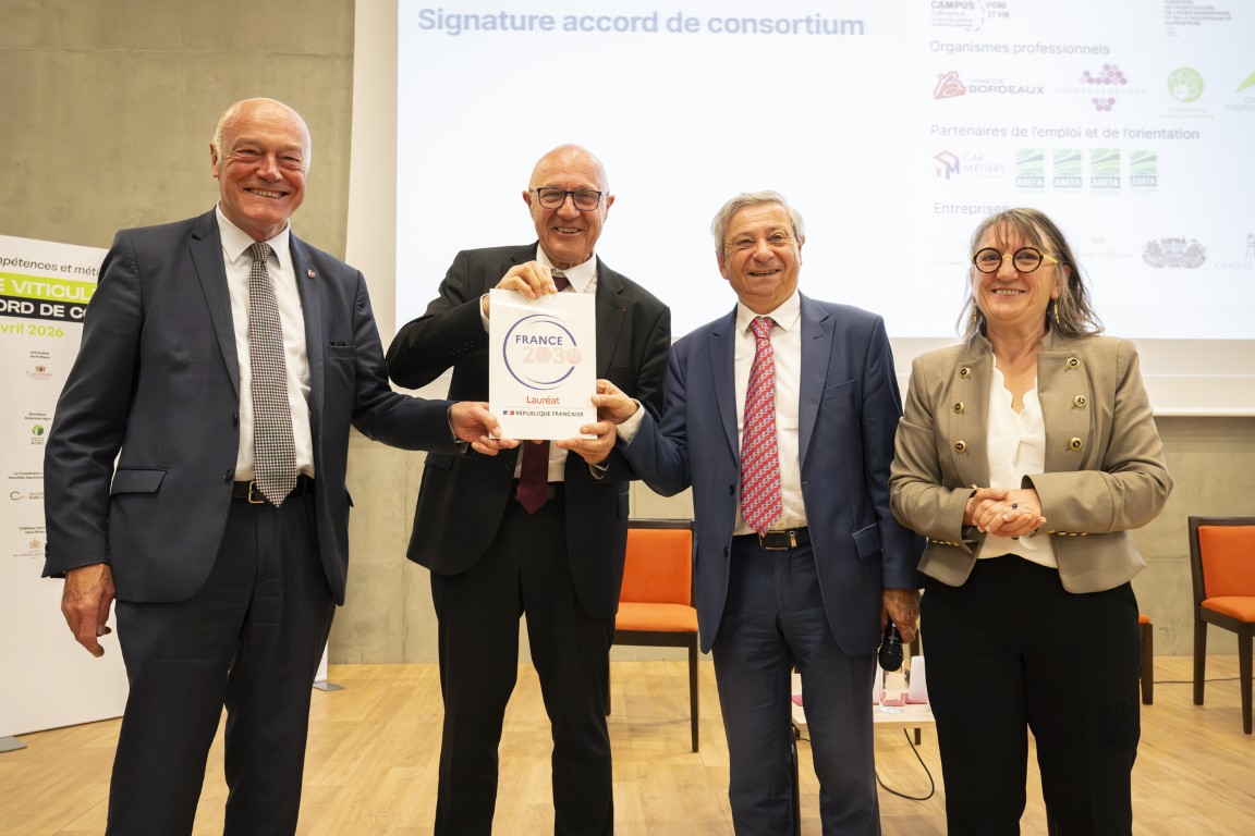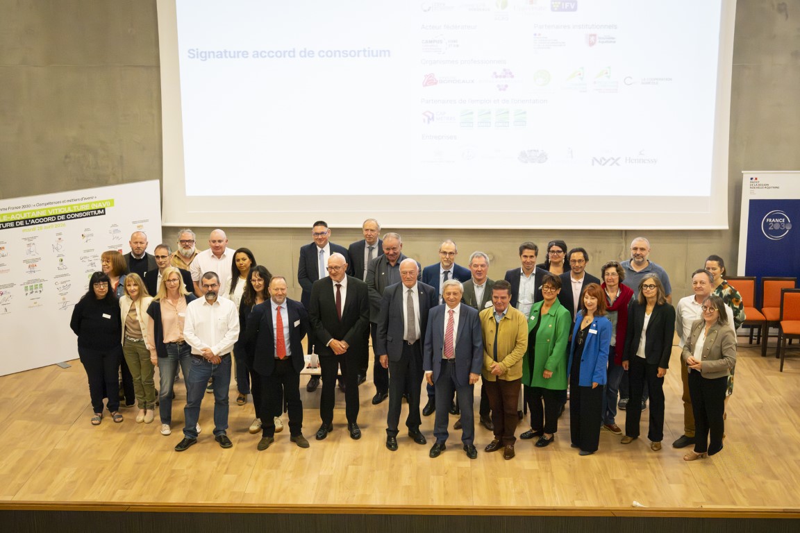 Étienne GUYOT, préfet de la région Nouvelle-Aquitaine, préfet de la Gironde, et Alain ROUSSET, président du Conseil régional de Nouvelle-Aquitaine, ont signé le mardi 28 avril 2026 l’accord de consortium du projet Nouvelle-Aquitaine Viticulture Innovation (NAVI), au lycée agricole de Blanquefort, en présence de Jean-Louis NEMBRINI, vice-président du Conseil régional en charge de l’éducation, de Virginie ALAVOINE, directrice de la DRAAF Nouvelle-Aquitaine et Myriam HUET, directrice de l’Agrocampus Bordeaux Gironde.