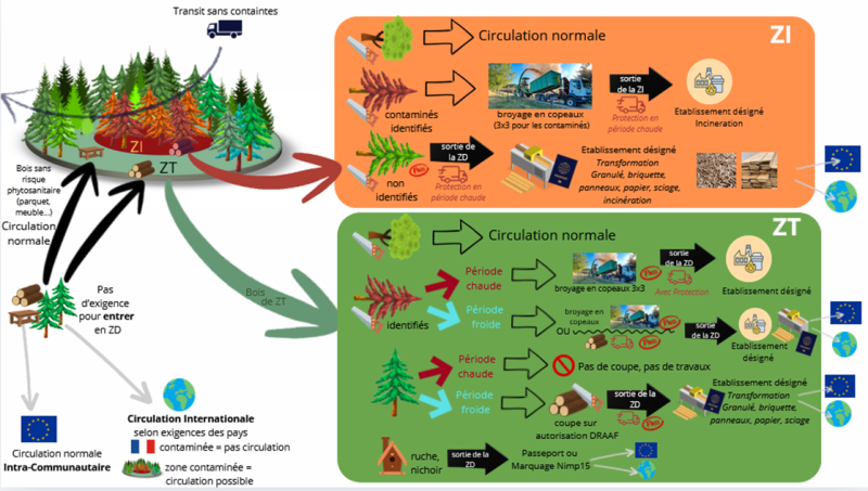 Cas particulier des bois abattus avant la découverte du foyer : le devenir des bois actuellement abattus et non évacués des forêts est une obligation prévue par la réglementation UE. Ils doivent être débardés puis transportés et accompagnés d’un laissez-passer phytosanitaire vers l’un des établissements désignés par la DRAAF situés dans ou à proximité de la zone délimitée, pour être transformés en granulés de bois, ou briquettes contreplaqué, ou panneaux de particules ou pâte à papier ou en sciages séchés à une température et pendant une durée garantissant la destruction du nématode et de son vecteur par des processus recourant à la colle, à la chaleur dans les conditions fixées par la NIMP 15, à la pression ou à une combinaison de ces techniques. Ils peuvent alors circuler avec un passeport phytosanitaire, vers l’extérieur de la zone délimitée si besoin, y compris vers et dans les pays de l’UE.