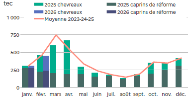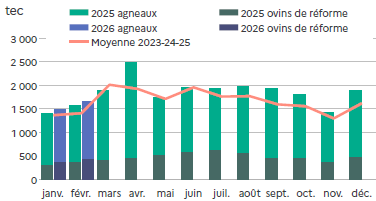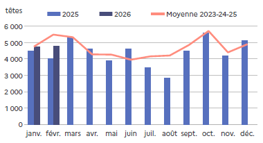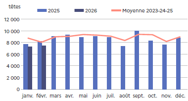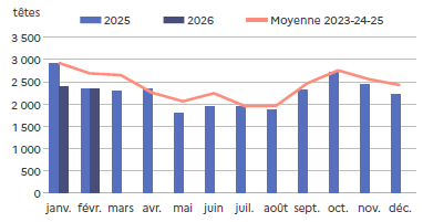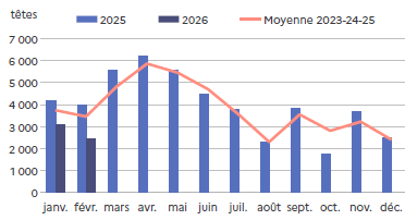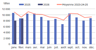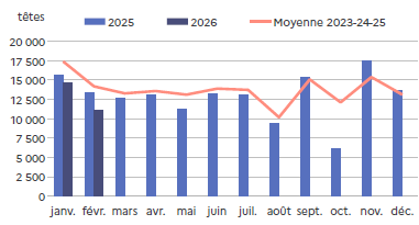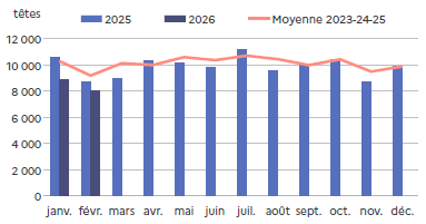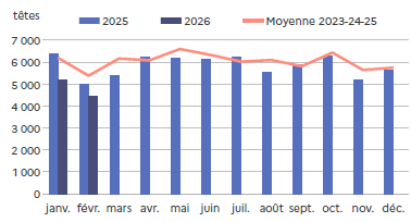 | février 2026 | Volume (t) | Nombre (têtes) | Poids moyen (kg/tête) |