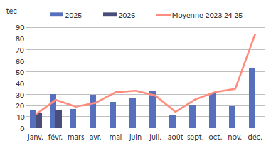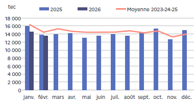 | février 2026 | Poids (t) | Nombre (têtes) | Poids cumulé (t) sur douze mois glissants | Nombre cumulé sur douze mois glissants |
