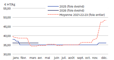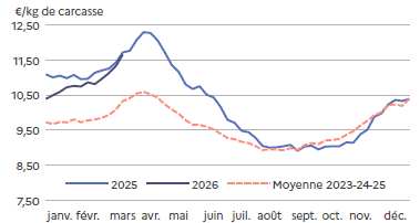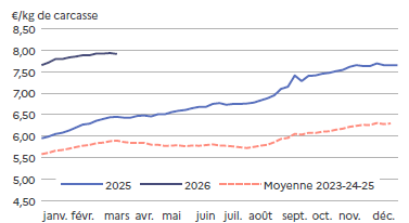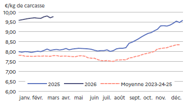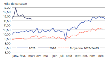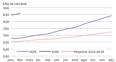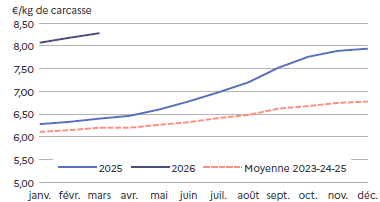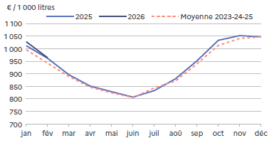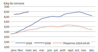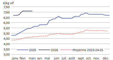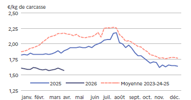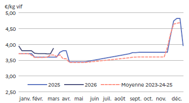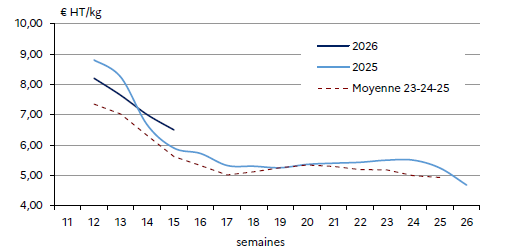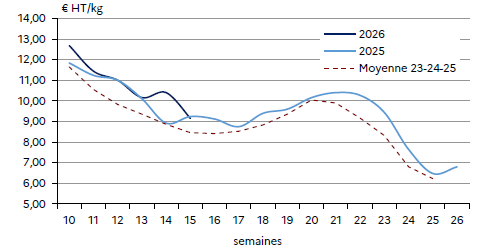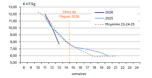 Les prix baissent rapidement mais sont en adéquation avec les quantités produites. Cette baisse permet de 2026fluidifier les ventes, d’accélérer la mise en place en GMS* et de garder une demande en adéquation avec la production générale. Et comme les fêtes pascales sont la première semaine d’avril, l’écoulement est régulier.