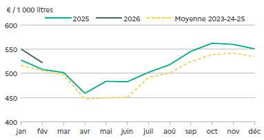 Graphique 2 : Prix mensuel du lait de vache en Nouvelle-Aquitaine