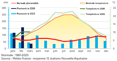 Graphique 1 : Pluviométrie et température mensuelles 2026
