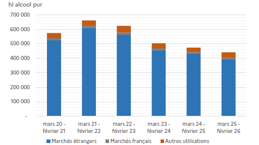 Coté commercialisation, à fin février 2026, 144,4 millions de bouteilles ont été expédiées dans le monde entier en cumul sur les douze derniers mois (404 310 hectolitres d’alcool pur) pour un chiffre d’affaires de 2,25 milliards d’euros. Sur un an, les volumes exportés reculent de plus de 8 % et la valeur de 21 %.