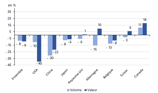 Sur l’ensemble des principaux marchés, l’Asie voit ses expéditions reculer de 15 % en volume sur un an (- 5 % en valeur), entraînée par la baisse des exportations de la Chine de 30 % en volume (- 22 % en valeur). En un an, avec 116 milliers d’hl cumulés, la Chine n’est plus la première destination en volume pour les vins de Bordeaux. Les États-Unis la devancent, avec près de 200 milliers d’hl, bien que les expéditions diminuent de 10 % en volume (40 % en valeur). Le Canada fait exception avec des exportations augmentant de 11 % en volume (18 % en valeur).