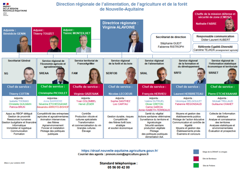 La dernière mise à jour de l’organigramme de la DRAAF Nouvelle-Aquitaine, disponible ci-après, date du mois d’octobre 2025 :