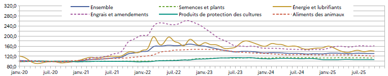 En octobre 2025, le prix d’achat des intrants agricoles est en hausse générale de 1,1 % par rapport à octobre 2024, avec des dynamiques différentes selon les catégories. Le prix de l’énergie et des lubrifiants varie peu entre septembre et octobre 2025. Il reste en forte baisse de plus de 12 % par rapport à janvier 2025, et de près de 7 % sur un an. L’indice de prix des engrais et amendements continue quant à lui sa progression, avec une hausse de plus de 10 % sur les douze derniers mois. L’indice des prix de l’alimentation animale continue sa baisse. En octobre 2025, il est inférieur de 4,0 % à sa valeur d’octobre 2024.