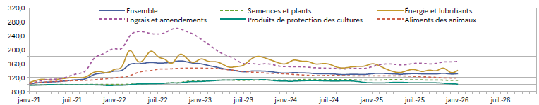 En janvier 2026, le prix d’achat des intrants agricoles est stable par rapport à janvier 2025, mais cette stabilité cache des dynamiques très variées. Les prix de l’énergie et des lubrifiants sont en forte baisse, de 11,7 % sur un an, mais en hausse par rapport à décembre 2025. L’alimentation animale est en baisse, de plus de 5 % sur un an, dont près de 10 % pour les aliments simples. Les produits de protection des cultures affichent une baisse moins marquée à −3,4 % sur un an. En revanche, les engrais et amendements, en légère hausse par rapport à décembre 2025, sont supérieurs de près de 10 % au prix de janvier 2025.