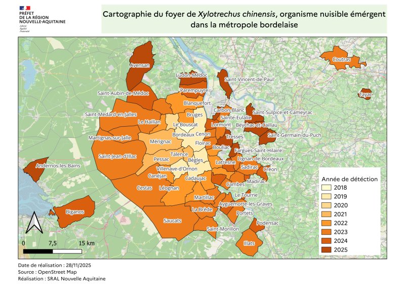 A noter que depuis 2022, la DRAAF-SRAL Nouvelle-Aquitaine et FREDON Nouvelle-Aquitaine réalisent des prospections de délimitation en Gironde dans le cadre de la surveillance renforcée mise en place et suite à signalement reçu. Les éléments recueillis permettront de préciser l’aire d’expansion du longicorne et d’avoir une idée de l’étendue des dégâts qui lui sont attribués.